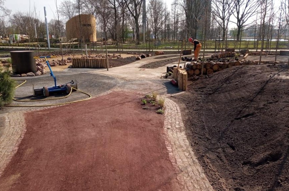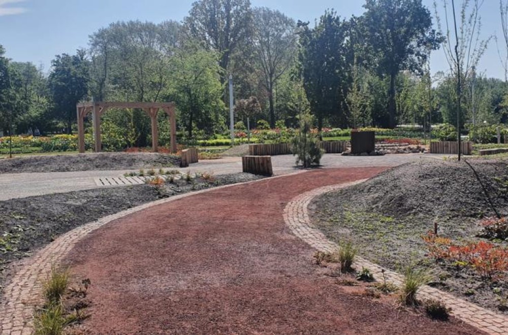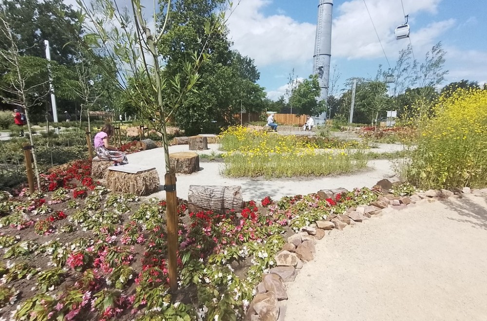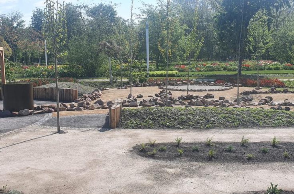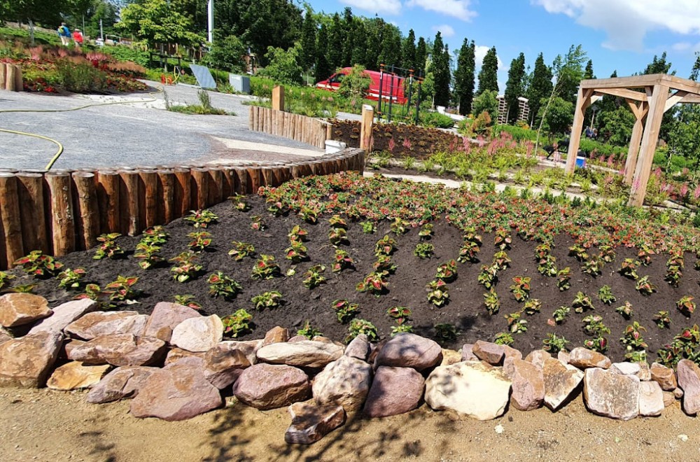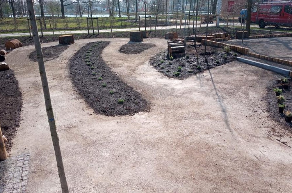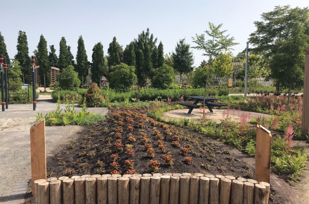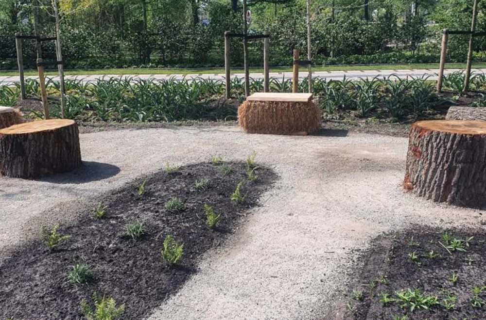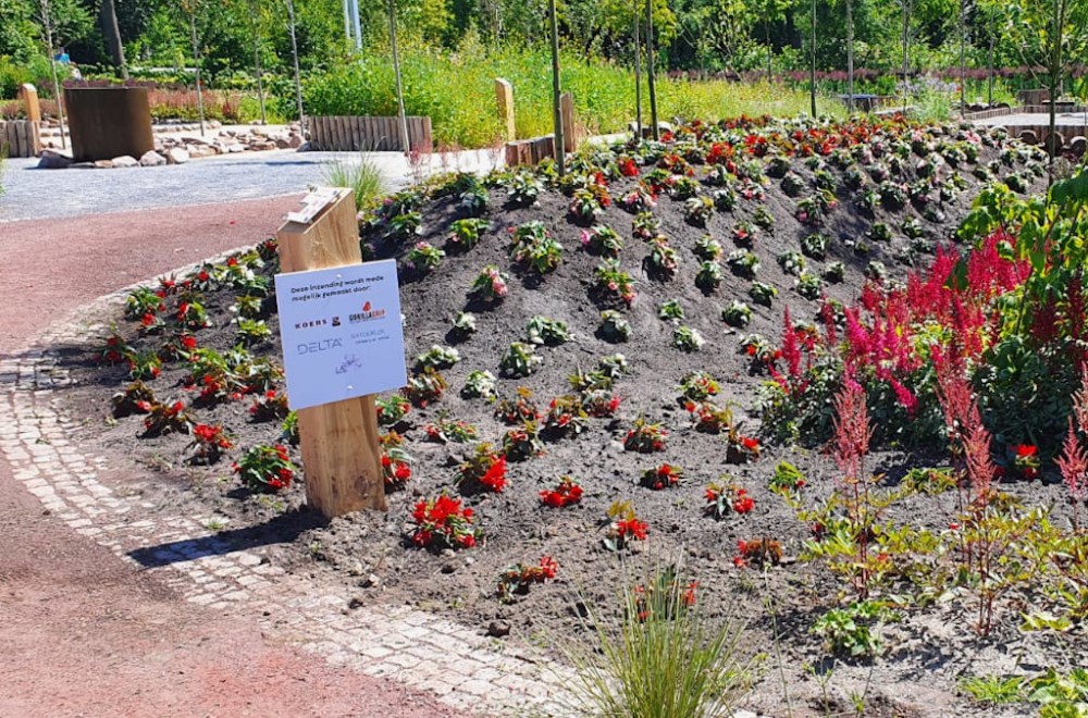 Einen Monat nach der Eröffnung im April hat sich das Grundstück in ein frisches Grün verwandelt. Nach häufigem Gießen wachsen und gedeihen die gepflanzten Bäume und Pflanzen nun. Und das Ergebnis sind wunderschöne Bilder! Jetzt lohnt es sich, das Grundstück zu besuchen und sich inspirieren zu lassen, z. B. für einen naturnahen Garten oder als nachhaltige Anwendung im öffentlichen Raum.