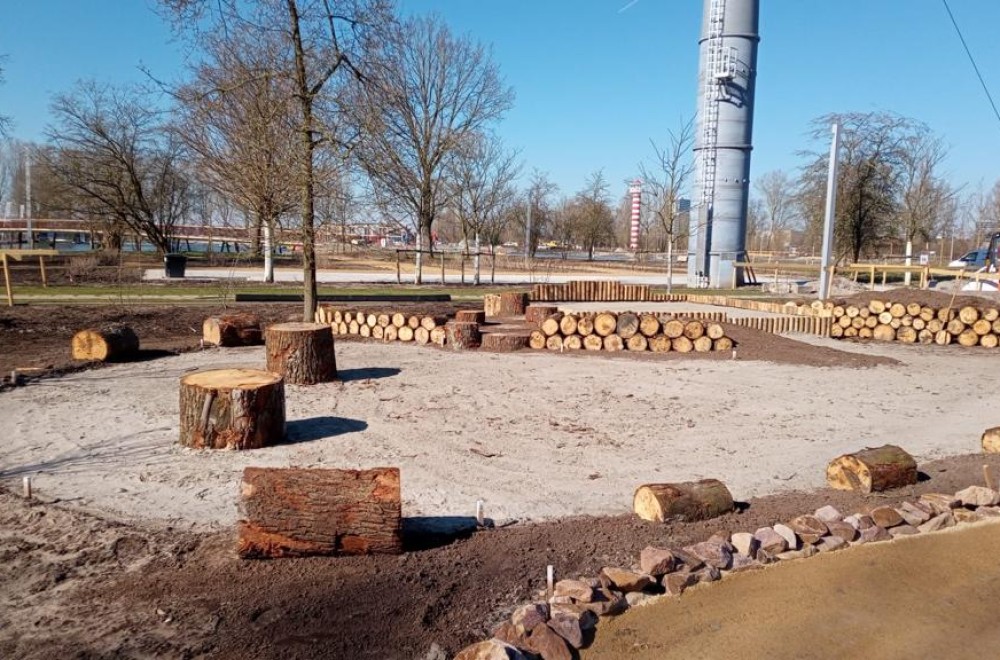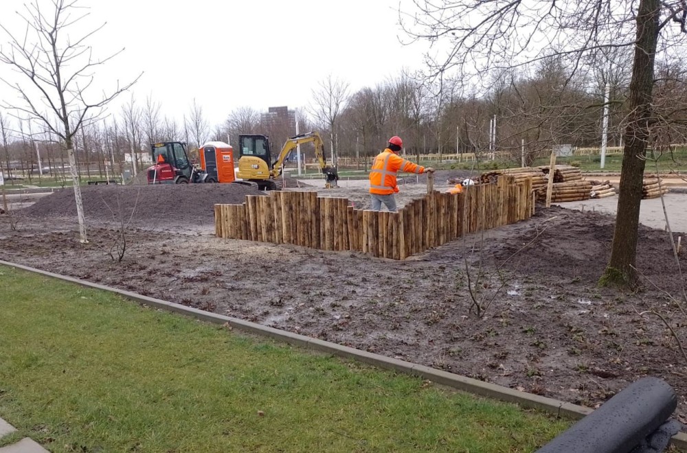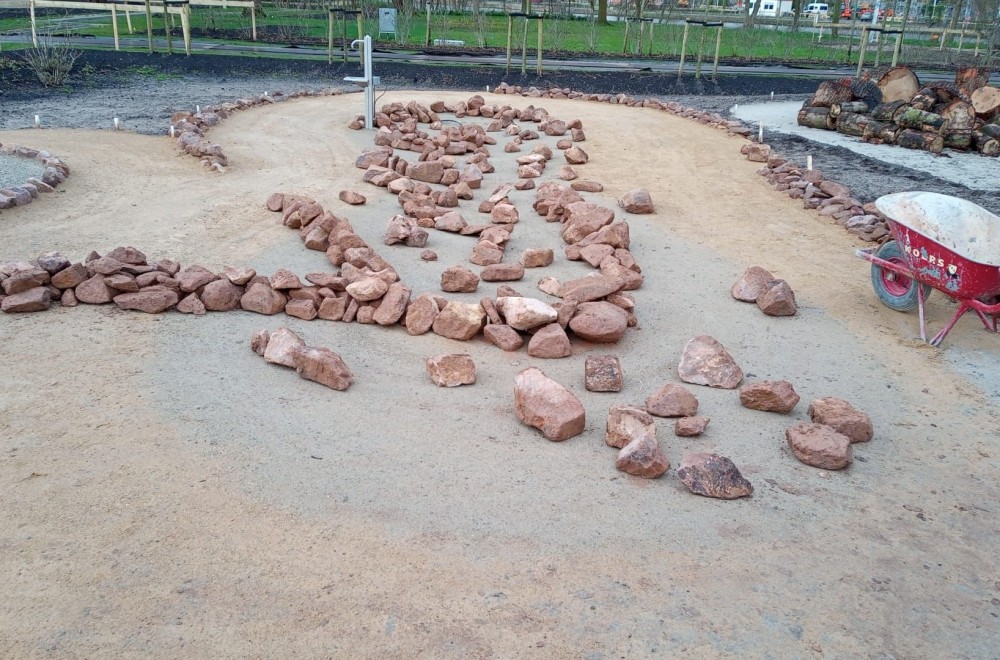 - Kern der Handlung: KoMex Antraciet, Bänke, Stützmauern (Holz) und Springbrunnen