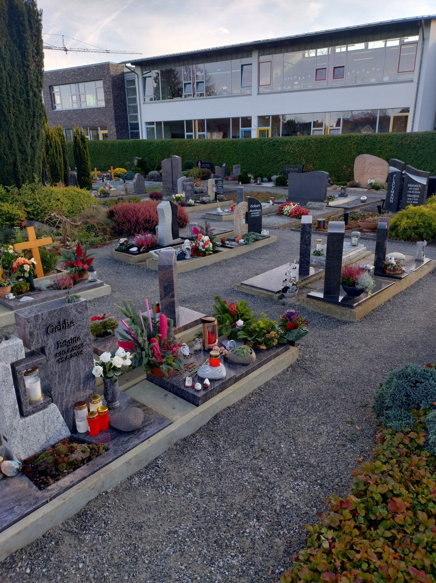 Die Friedhofsgärtnerei der Firma Seveneick hat im September in der südöstlichen Ecke vom Friedhof in Hörstel mit Koers DurEko-mix die Flächen zwischen den Gräber gepflastert. Das Ergebniss sieht sehr charmant aus. Das graue der Deckschicht ist ein Match zu den Randeinfassungen der Wege und der Gräber. Die Farben der Blumenarrangements, Kerzen und anderer Dekorationen, die Besucher aus Liebe zu ihren verstorbenen Angehörigen mitgebracht haben, sind ein Blickfang und verleihen dem Ganzen eine warme, emotionale Atmosphäre.