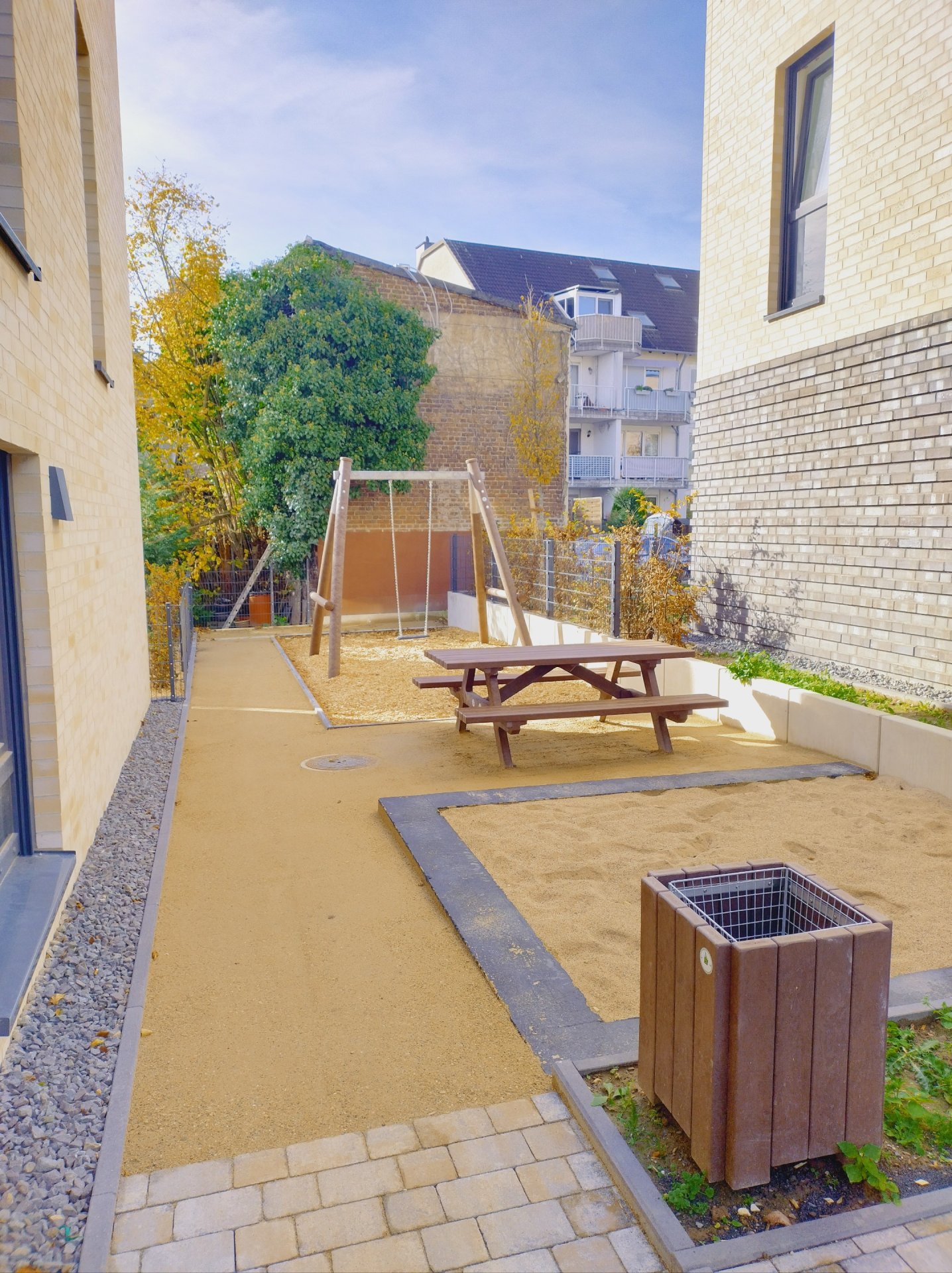 À l’automne 2025, l’entreprise Galabau Rainer Eschbach de Much a appliqué des couches de surface en Koers KoMex Jaune sur plusieurs petites aires de jeux et allées piétonnes dans le nouveau quartier résidentiel de la Uferstraße à Leichlingen. Le quartier comprend 69 nouveaux appartements en copropriété répartis sur cinq bâtiments, à seulement quelques centaines de mètres de la Wupper et du centre-ville.
