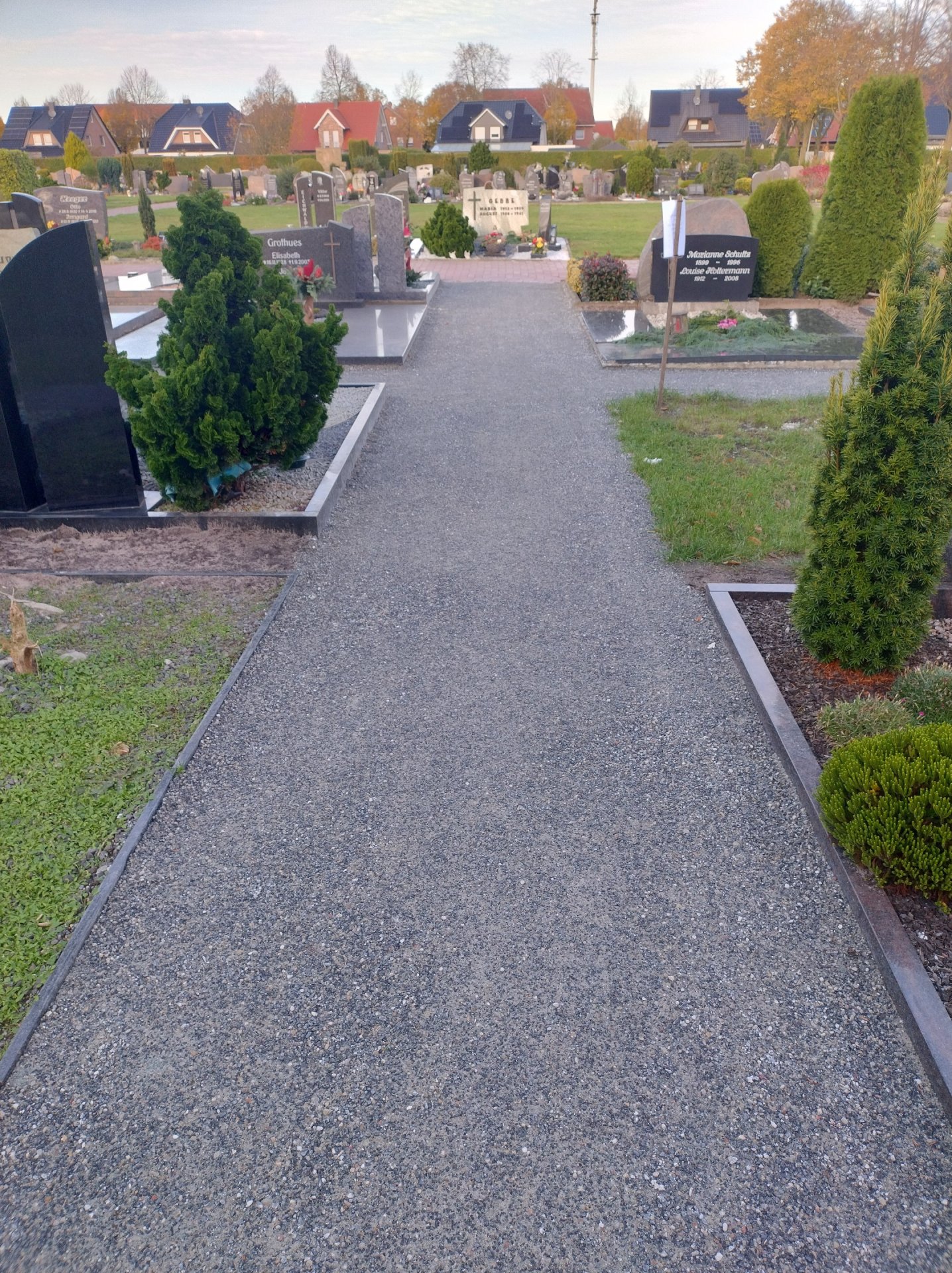 De begraafplaatsaanlegger van het bedrijf Seveneick heeft in september in de zuidoostelijke hoek van de begraafplaats in Hörstel de zones tussen de graven verhard met Koers DurEko-mix. Het resultaat oogt zeer charmant. De grijze kleur van de toplaag sluit mooi aan bij de randafwerkingen van de paden en de graven. De kleuren van de bloemenarrangementen, kaarsen en andere decoraties die bezoekers uit liefde voor hun overleden dierbaren hebben meegebracht, trekken de aandacht en geven het geheel een warme, emotionele sfeer.