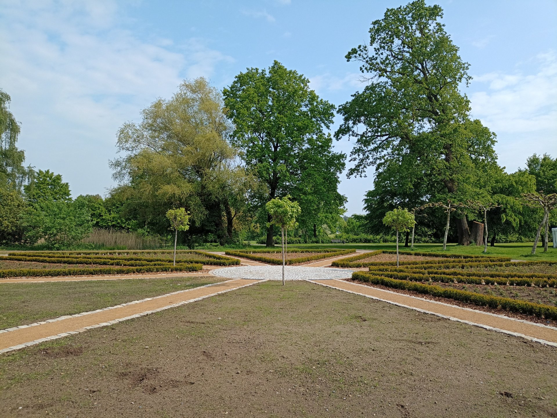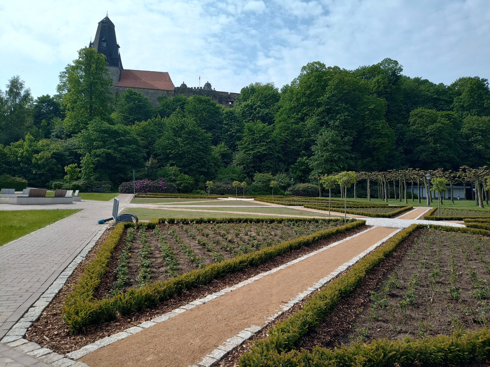 De paden rond de fontein in het historische kasteelpark Burg Bentheim zijn in het voorjaar van 2023 opnieuw aangelegd met KoMex geel door GaLaBau Emsland uit Lingen.
